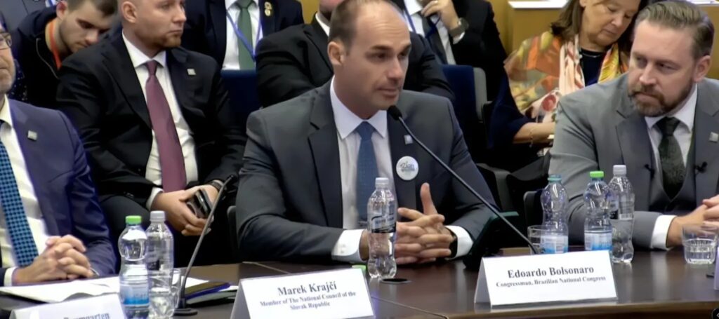 Eduardo também alegou que facções brasileiras mantêm ligação com grupos como o Hezbollah e a Jihad Islâmica. Apesar de ter tido o mandato cassado, ele foi apresentado no evento como parlamentar brasileiro. Durante a fala, acusou ainda, sem apresentar provas, Organizações Não Governamentais de atuarem como fachada para a estruturação das facções criminosas no país.