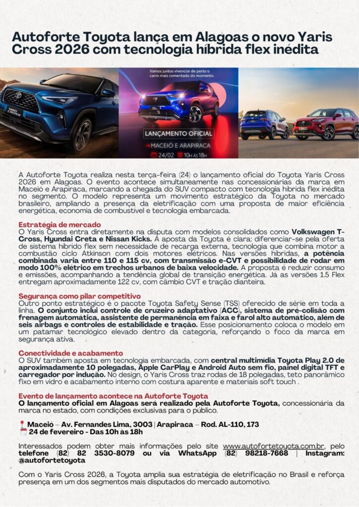 Home»ALAGOAS»Autoforte Toyota lança em Alagoas o novo Yaris Cross 2026 com tecnologia híbrida flex inédita