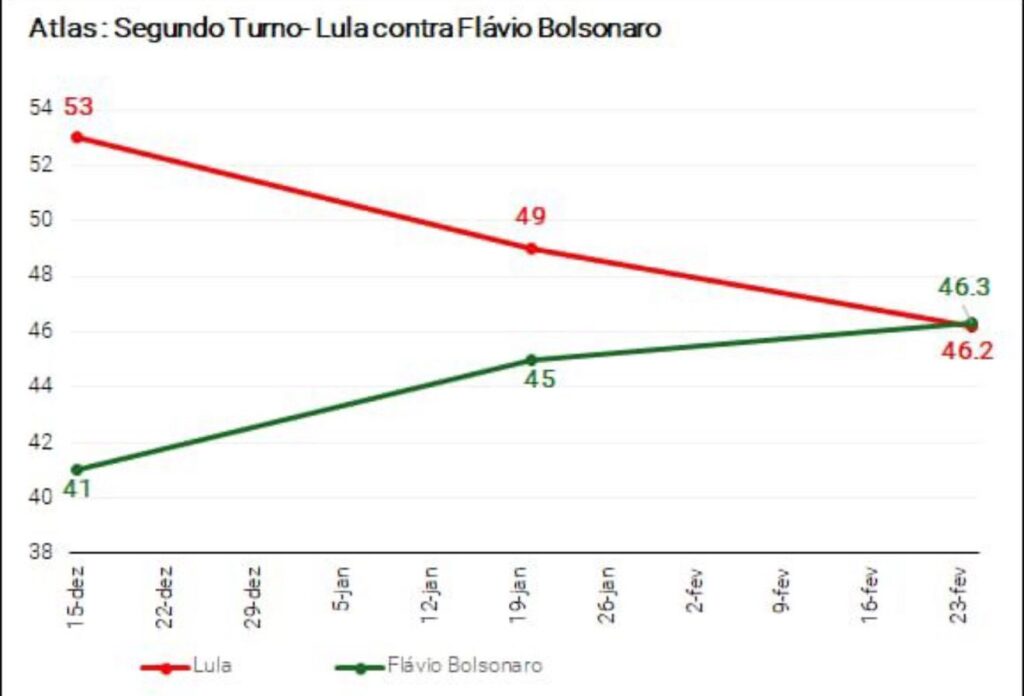 A Bloomberg divulgou há pouco a pesquisa Atlas. Em cenário de segundo turno, Flávio Bolsonaro tem 46,3% das intenções de voto e Lula, 46,2% – em janeiro, o atual presidente liderava por 49% a 45%.
